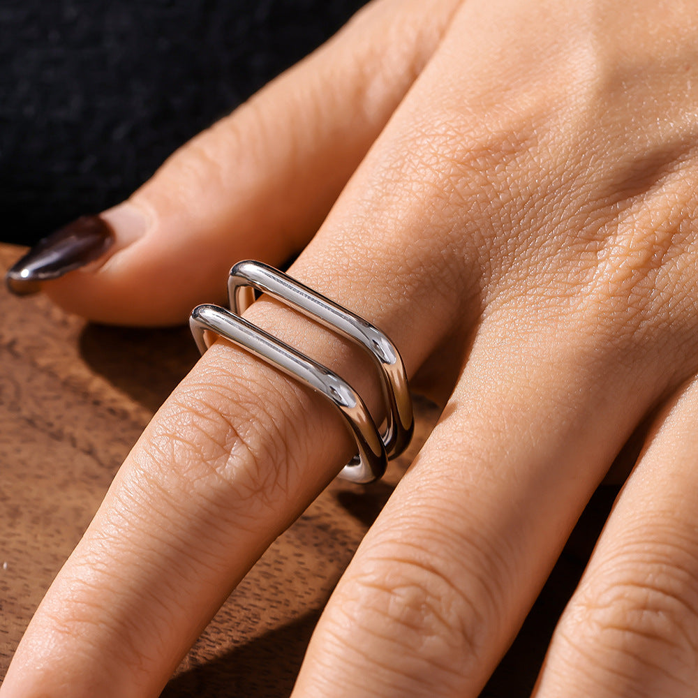 This women's creative double-hollowed U-shaped opening ring shows a modern fashion aesthetic with a unique design. The ring adopts double-layer hollow design, U-shaped outline is simple and atmospheric, highlighting exquisite craft and light luxury texture. The open design makes it flexible to different finger sizes, comfortable to wear and full of personality. Whether it's with a simple everyday style or for a special occasion, this ring is designed to stand out from the crowd and make your hands look elegant and creative.